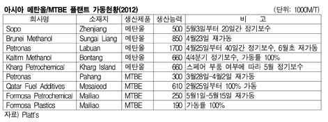 표, 그래프: < 아시아 메탄올/MTBE 플랜트 가동현황(2012) > <화학저널 2012/05/11> |