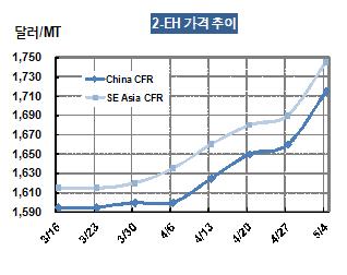 아시아 2-EH(2-Ethylhexanol) 가격이 5월3일 CRF China 톤당 1715달러로 55달러 상승했다. 중국의 다운스트림 생산기업들은 5월 구매가격으로 CFR China 톤당 1170달러를 제시해 2-EH를 공급받지 못한 것으로 알려졌다. 표, 그래프: < 2-EH 가격추이 > <화학저널 2012/05/11> |