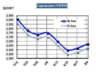 아시아 CPL(Caprolactam) 가격이 원료인 벤젠(Benzene) 가격 상승으로 5월3일 CFR FEAsia 톤당 2570달러로 50달러 상승했다. 유럽의 벤젠 가격은 CIF ARA 톤당 1270달러로 90달러 폭등했으며 4월 초 이후 7.6% 상승했다. 5월 첫째 주 우크라이나를 출발한 물량은 CFR FE Asia 톤당 2570달러에 거래된 것으로 알려졌다. 표, 그래프: < Caprolactam 가격추이 > <화학저널 2012/05/11> |