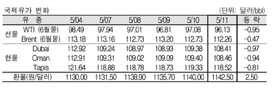 5월11일 국제유가는 중국의 경기지표 둔화, 유로존 정국 불안 등으로 하락했다.
