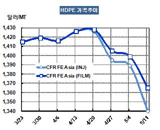 HDPE 가격은 5월9일 CFR FE Asia 톤당 1340달러로 49달러 폭락했다.