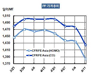 PP 가격은 5월9일 CFR FE Asia 톤당 1384달러로 50달러 폭락했다. 특히, 국제유가가 WTI(서부텍사스 경질유) 기준 배럴당 96달러로 100달러가 붕괴되고 북해산 브렌트유도 곧 110달러가 무너질 것으로 보여 PP 역시 추가 하락이 불가피해지고 있다. 표, 그래프: < PP 가격추이 > <화학저널 2012/05/15> |