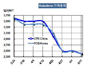 부타디엔 가격은 5월11일 FOB Korea 톤당 2390달러로 100달러 급락했다. 부타디엔 시장은 수요가 부진한 가운데 재고 부담이 가중되고 있는 것으로 나타나고 있다. 표, 그래프: < Butadiene 가격추이 > <화학저널 2012/05/15> |
