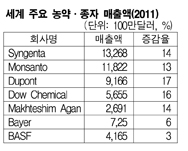 2011년 세계 주요 농약ㆍ종자 생산기업들이 남미와 아시아ㆍ태평양 수요 확대에 힘입어 10% 이상 성장한 것으로 나타났다. 표, 그래프: < 세계 주요 농약․종자 매출액(2011) > <화학저널 2012/05/15> |