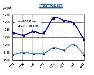 벤젠 가격은 5월11일 FOB Korea 톤당 1175달러로 27달러 하락했다. 미국의 벤젠 가격도 FOB US Gulf 갤런당 405센트로 톤당 1215달러를 형성해 전주에 비해 42달러 급락했다. 표, 그래프: < Benzene 가격추이 > <화학저널 2012/05/16> |