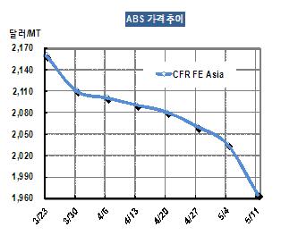 ABS 가격은 5월9일 CFR FE Asia 톤당 1965달러로 70달러 폭락했다.