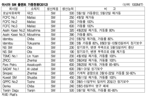 아시아 SM(Styrene Monomer) 플랜트 대부분이 정기보수를 끝내고 재가동을 시작해 공급과잉 조짐을 나타내고 있다. 한편, 일본 Denka는 Chiba 소재 SM 24만톤 플랜트를 5월5-6일부터 영구적으로 폐쇄했으나 시장에 미치는 영향은 거의 없는 것으로 나타났다. <주미하 기자> 표, 그래프: < 아시아 SM 플랜트 가동현황(2012) > <화학저널 2012/05/22> |