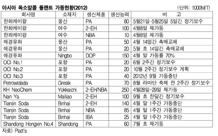아시아 옥소알콜(Oxo-Alcohol) 시장이 가동중단으로 수급이 타이트할 것으로 예상된다. 해외에서는 Petrosidada가 Gresik 소재 PA 7만톤 플랜트를 8월 2주간 정기보수하고, Nan Ya는 Mailiao 소재 2-EH(2-Ethylhexanol) 10만톤 플랜트를 9월 한달간 정기보수한다. 표, 그래프: < 아시아 옥소알콜 플랜트 가동현황(2012) > <화학저널 2012/05/23> |