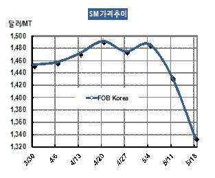 SM 가격은 5월18일 FOB Korea 톤당 1335달러로 97달러 폭락했다. 여기에 유럽에서 그리스가 정부를 구성하지 못하고 6월 총선으로 이어지고 스페인까지 부도위기에 몰리면서 글로벌 경제침체 가능성이 제기돼 폭락을 유인했다. 표, 그래프: < SM 가격추이 > <화학저널 2012/05/23> |