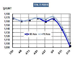 아시아 PTA(Purified Terephthalic Acid) 가격이 세계경제 침체에 대한 우려로 5월18일 CFR China 톤당 1094달러로 45달러 하락했다. 미국 농무부의 최신 보고서에 따르면, 2012-13년 세계 면화 재고가 7370만베일(bale)로 10% 증가할 것으로 예상되고 있고, 중국의 정책적 재고 축적으로 2011/12년과 2012/13년 모두 생산이 소비를 넘어설 것으로 예측되고 있다. 표, 그래프: < TPA 가격추이 > <화학저널 2012/05/24> |