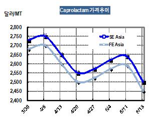 아시아 CPL(Caprolactam) 가격이 5월17일 CFR FE Asia 톤당 2450달러로 140달러 폭락했다. CPL 생산기업들은 벤젠과 CPL의 스프레드가 적어도 톤당 1300달러를 넘어야 하기 때문에 유럽의 벤젠 가격이 CIF ARA 톤당 1195달러를 형성해 CPL 가격이 최소 CFR FE Asia 톤당 2495달러는 돼야 한다고 주장하고 있다. 표, 그래프: < Caprolactam 가격추이 > <화학저널 2012/05/25> |
