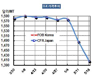 O-X 가격은 5월18일 FOB Korea 톤당 1405달러로 80달러 폭락했다. 원료인 Isomer 그레이드 M-X(Mixed-Xylene) 가격도 FOB Korea 톤당 1110달러로 68달러 폭락했다. 표, 그래프: < O-X 가격추이 > <화학저널 2012/05/25> |