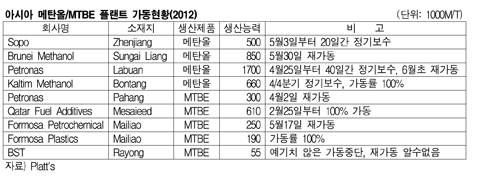 아시아 메탄올(Methanol) 및 MTBE(Methyl tert-Butyl Ether) 가동률이 다시 상승하고 있다. Formosa Petrochemical은 Mailiao 소재 MTBE 25만톤 플랜트를 5월17일부터 재가동했다. 표, 그래프: < 아시아 메탄올/MTBE 플랜트 가동현황(2012) > <화학저널 2012/05/25> |