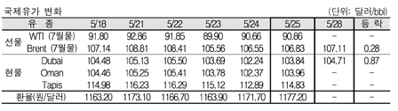 두바이(Dubai)유 현물가격이 다시 103달러를 넘어섰다. 뉴욕상업거래소(NYMEX)는 미국 현충일을 맞아 휴장함으로써 WTI(서부텍사스 경질유) 선물은 가격이 형성되지 않았다. 표, 그래프: < 국제유가 변화 > <화학저널 2012/05/29> |