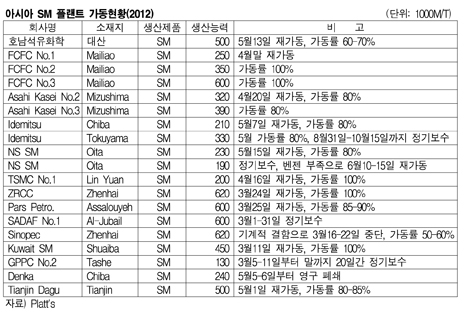 아시아 SM(Styrene Monomer) 시장이 플랜트의 풀가동으로 공급과잉 우려가 제기되고 있다. 유럽 및 미국의 경기 침체로 중국의 전자제품 생산이 둔화되면서 SM의 다운스트림인 PS(Polystyrene)와 ABS(Acrylonitrile Butadiene Styrene)의 수요가 감소함으로써 SM 시장에 영향을 미치고 있기 때문이다. 표, 그래프: < 아시아 SM 플랜트 가동현황(2012) > <화학저널 2012/05/29> |