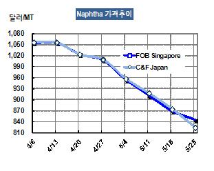 나프타 가격은 5월26일 CFR Japan 톤당 824달러로 50달러 폭락했다. 여기에 기초유분 시세가 폭락을 거듭한 영향으로 나프타 베이스 스팀 크래커의 가동률이 떨어져 수요 감소로 이어졌기 때문이다. 표, 그래프: < Naphtha 가격추이 > <화학저널 2012/05/30> |