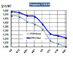 프로필렌 가격은 5월26일 FOB Korea 톤당 1195달러로 25달러 하락했다. 그러나 중국 수요가 살아날 기미를 보이지 않고 있어 7월 거래물량이 나오는 6월 초에는 1100달러대 중반으로 떨어질 가능성이 높아지고 있다. 표, 그래프: < Propylene 가격추이 > <화학저널 2012/05/30> |