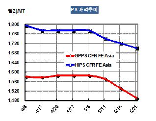 GPPS 가격은 5월24일 CFR FE Asia 톤당 1490달러로 40달러 폭락했다. 특히, 최종수요처들이 GPPS 가격이 추가 하락할 것으로 보고 구매에 소극적으로 임해 추가 폭락이 불가피해지고 있다. 표, 그래프: < PS 가격추이 > <화학저널 2012/05/31> |