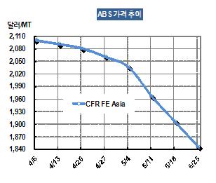 ABS 가격은 5월24일 CFR FE Asia 톤당 1845달러로 60달러 폭락했다. AN(Acrylonitrile)은 CFR FE Asia 톤당 1850달러로 약보합세를 나타냈으나 부타디엔(Butadiene)은 전주에 FOB Korea 톤당 2190달러로 200달러 폭락한데 이어 5월25일 1970달러로 220달러 추가 폭락했다. 표, 그래프: < ABS 가격추이 > <화학저널 2012/05/31> |