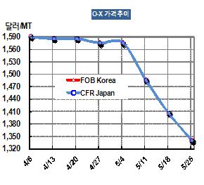 O-X 가격은 5월26일 FOB Korea 톤당 1340달러로 65달러 폭락했다.