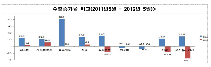 5월에도 석유화학제품 수출 부진이 이어졌다. 석유화학은 2011년 5월 수출액이 39억달러로 31.4% 증가했으나 2012년 5월에는 32억3000만달러로 17.1% 감소했다. 표, 그래프: < 수출증가율 비교(2011년5월 - 2012년 5월) > <화학저널 2012/06/01> |