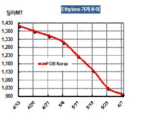 에틸렌 가격은 6월1일 FOB Korea 톤당 990달러로 40달러 급락했다. 에틸렌 바이어들은 동북아시아 가격이 아직 바닥으로 떨어지지 않았다고 판단하고 구매를 미룸으로써 현물가격 하락을 가속화시키고 있다. 표, 그래프: < Ethylene 가격추이 > <화학저널 2012/06/04> |