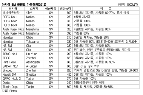 아시아 SM(Styrene Monomer) 시장은 플랜트 풀가동 지속으로 공급과잉이 나타나고 있다. GPPC는 Tashe 소재 No.2 및 No.3 37만톤 플랜트를 5월부터 가동률 100%로 유지하고 있다. 표, 그래프: < 아시아 SM 플랜트 가동현황(2012) > <화학저널 2012/06/05> |