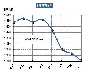 SM 가격은 6월1일 FOB Korea 톤당 1276달러로 35달러 하락했다.
