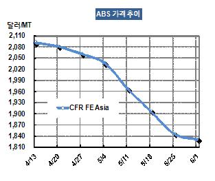 ABS 가격은 5월30일 CFR FE Asia 톤당 1845달러로 15달러 하락했다. 중국 내수가격도 동부지역 기준 ex-works 톤당 1만4300-1만4500위안으로 수입가격 기준 1814-1839달러로 떨어졌다. 표, 그래프: < ABS 가격추이 > <화학저널 2012/06/07> |