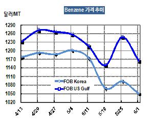 벤젠 가격은 6월1일 FOB Korea 톤당 1050달러로 43달러 급락했다.