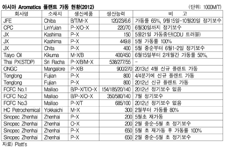 아시아 아로마틱(Aromatics) 플랜트의 상반기 가동률이 저조한 것으로 나타났다. 다만, JX에너지는 Kashima 소재 P-X 44만9800톤 플랜트를 100% 가동하고 있고, Sinopec Zhenhai도 Zhenhai 소재 P-X 65만톤 플랜트를 100% 가동하고 있다. 표, 그래프: < 아시아 Aromatics 플랜트 가동 현황(2012) > <화학저널 2012/06/07> |
