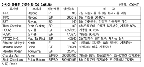 아시아 올레핀 플랜트의 가동률이 낮은 수준을 유지하고 있다. Titan Chemical은 Pasir Gudang 소재 부타디엔 10만톤 플랜트를 4월23일부터 10일간 정기보수한 후 현재 80% 수준으로 가동하고 있다. 표, 그래프: < 아시아 올레핀 가동현황 (2012.05.28) > <화학저널 2012/06/08> |