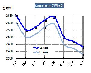 CPL(Caprolactam) 가격은 6월1일 CFR FE Asia 2380달러로 40달러 하락했다. 중국시장 관계자는 “시장 상황이 전반적으로 매우 위축된 상황에서 국제유가 폭락이 더해져 CPL 시장에 악영향을 끼치고 있다”고 밝혔다. 표, 그래프: < Caprolactam 가격추이 > <화학저널 2012/06/08> |
