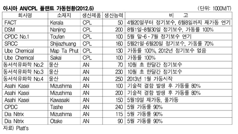 표, 그래프: < 아시아 AN/CPL 플랜트 가동현황(2012.6) > <화학저널 2012/06/14> |