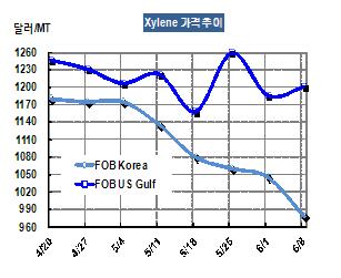 M-X 가격은 6월8일 FOB Korea 톤당 978달러로 67달러 급락했다. Isomer 그레이드 M-X 가격이 FOB Korea 톤당 1021달러로 36달러 떨어진 것도 영향을 미쳤다. 표, 그래프: < Xylene 가격추이 > <화학저널 2012/06/14> |