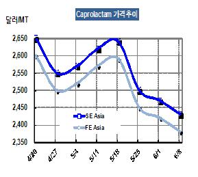 CPL(Caprolactam) 가격이 6월7일 CFR FE Asia 톤당 2280달러로 100달러 폭락했다. 시장 관계자는 “바이어들은 CPL 가격이 더 떨어질 것으로 보고 구매를 보류하고 있으며, 생산기업들은 가격하락을 막기 위해 플랜트의 가동률을 낮출 움직임을 보이고 있다”고 밝혔다. 표, 그래프: < Caprolactam 가격추이 > <화학저널 2012/06/14> |