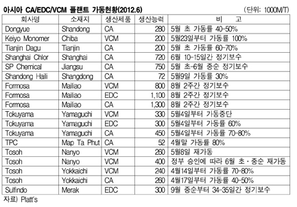 아시아 VCM(Vinyl Chloride Monomer) 수급타이트 정도가 심화돼 하반기 시장상황이 악화될 전망이다. 한편, Formosa는 Mailiao 소재 VCM 80만톤, EDC 110만톤, CA 130만톤 플랜트를 8월 2주간 정기보수할 예정이다. 표, 그래프: < 아시아 CA/EDC/VCM 플랜트 가동현황(2012.6) > <화학저널 2012/06/15> |