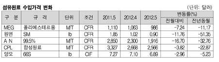 합섬원료 가격이 5월 사상최대로 폭락했다. 양모는 비수기로 인한 수요 감소와 AUS달러 약세의 영향을 받아 CIF 파운드당 6.89달러 3.0% 떨어져 하락의 폭이 크지 않았다. <이민지 기자> 표, 그래프: < 섬유원료 수입가격 변화 > <화학저널 2012/06/15> |