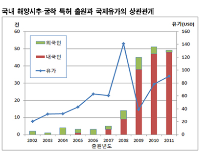 최근 석유, 가스 개발을 위한 해양시추, 굴착 관련특허 출원이 급증하고 있다. 표, 그래프: < 국내 해양시추·굴착 특허 출원과 국제유가의 상관관계 > <화학저널 2012/06/18> |