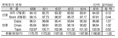 6월15일 국제유가는 글로벌 경기 부양책에 대한 기대감으로 상승했다. 6월15일 국제유가는 G20이 그리스 총선 결과에 따라 필요하면 각국 중앙은행들이 금융시장 안정을 위해 유동성 공급에 나설 것이라고 밝힌 영향으로 상승했다. 표, 그래프: < 국제유가 변화 > <화학저널 2012/06/18> |