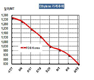 에틸렌 가격은 6월15일 FOB Korea 톤당 831달러로 99달러 폭락했다. 주초에는 공급기업들이 CFR 900달러 이하로는 판매할 수 없다고 버텼으나 일본 무역상들이 7월 공급되는 한국산을 FOB 830달러에 구매했다는 소식이 전해지면서 급락세로 전환됐다. 표, 그래프: < Ethylene 가격추이 > <화학저널 2012/06/18> |