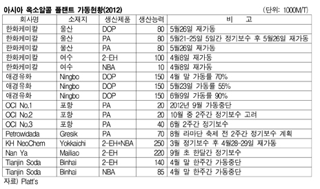 표, 그래프: < 아시아 옥소알콜 플랜트 가동현황(2012) > <화학저널 2012/06/18> |