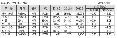희소금속 수입가격이 소폭 하락했다. 특히, 바나듐은 거래부진 및 수요 감소로 FOB 톤당 3만2725달러로 4.0% 급락했다. 표, 그래프: < 희소금속 수입가격 변화 > <화학저널 2012/06/18> |