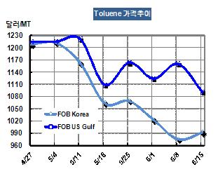톨루엔 가격은 6월15일 FOB Korea 톤당 996달러로 17달러 상승했다. 결과적으로 8월 및 9월 톨루엔 스프레드(판매가격-원료가격)가 톤당 13달러로 개선됐다. 표, 그래프: < Toluene 가격추이 > <화학저널 2012/06/21> |