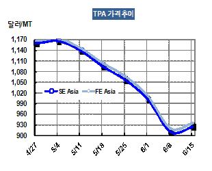 PTA 가격은 6월15일 CFR China 톤당 925달러로 14달러 상승했다. 중국의 폴리에스터(Polyester) 생산-판매 비율이 70% 수준으로 지지부진한 것이 상승을 제한한 것으로 판단된다. 일부 폴리에스터 공장은 수요 저조로 가동률을 60%-70% 정도로 감축해 운영하고 있다. <화학저널 2012/06/21> |