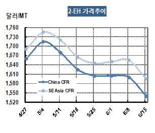 2-EH 가격이 CFR China 톤당 1540달러로 60달러 급락했다. 한편, 아시아 NBA(n-Butanol) 가격은 6월14일 CFR China 톤당 1260달러로 40달러 하락했다. 표, 그래프: < 2-EH 가격추이 > <화학저널 2012/06/22> |