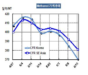 메탄올(Methanol) 가격이 6월15일 CFR China 톤당 364달러로 3.7% 하락했다. 아시아 시장은 생산기업과 바이어의 입장 차이가 좁혀지지 않아 바이어들이 철수했으며, 생산기업들은 지난 몇 주간 메탄올이 낮은 가격을 유지해 더는 낮출 수 없다는 입장을 분명히 했다. 표, 그래프: < Methanol 가격추이 > <화학저널 2012/06/22> |