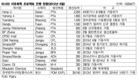 표, 그래프: < 아시아 석유화학 프로젝트 진행 현황(2012년 6월) > <화학저널 2012/06/22> |