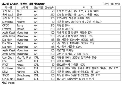 아시아 CPL(Caprolactam) 시장의 공급과잉이 완화될 조짐을 보이고 있다. 한편, 아시아 AN(Acrylonitrile) 시장은 공급과잉이 더욱 심화되고 있다. 표, 그래프: < 아시아 AN/CPL 플랜트 가동현황(2012) > <화학저널 2012/06/26> |
