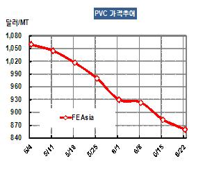 PVC 가격은 6월19일 CFR FE Asia 톤당 860달러로 23달러 급락했다. 미국의 PVC 생산기업들이 경쟁력 있는 수준에 오퍼하고 있어 아시아 생산기업들도 가격을 인하하지 않을 수 없기 때문이다. 표, 그래프: < PVC 가격추이 > <화학저널 2012/06/26> |
